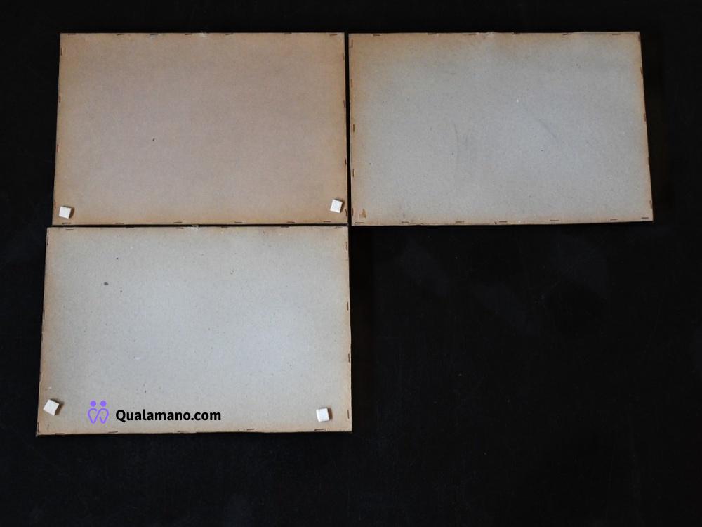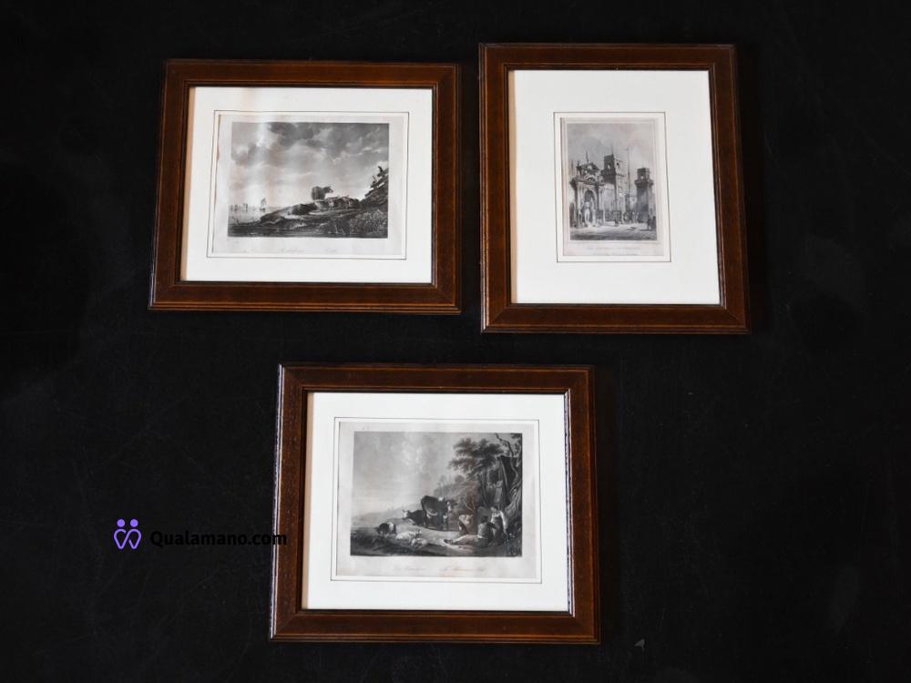 N. 3 quadri con paesaggi pastorali e architetture in bianco e nero. Rivestimento posteriore decorato con cartiglio originale identificativo del laboratorio “Antichità Restauro Bertoncello” Dimensioni con cornice 36x32 cm