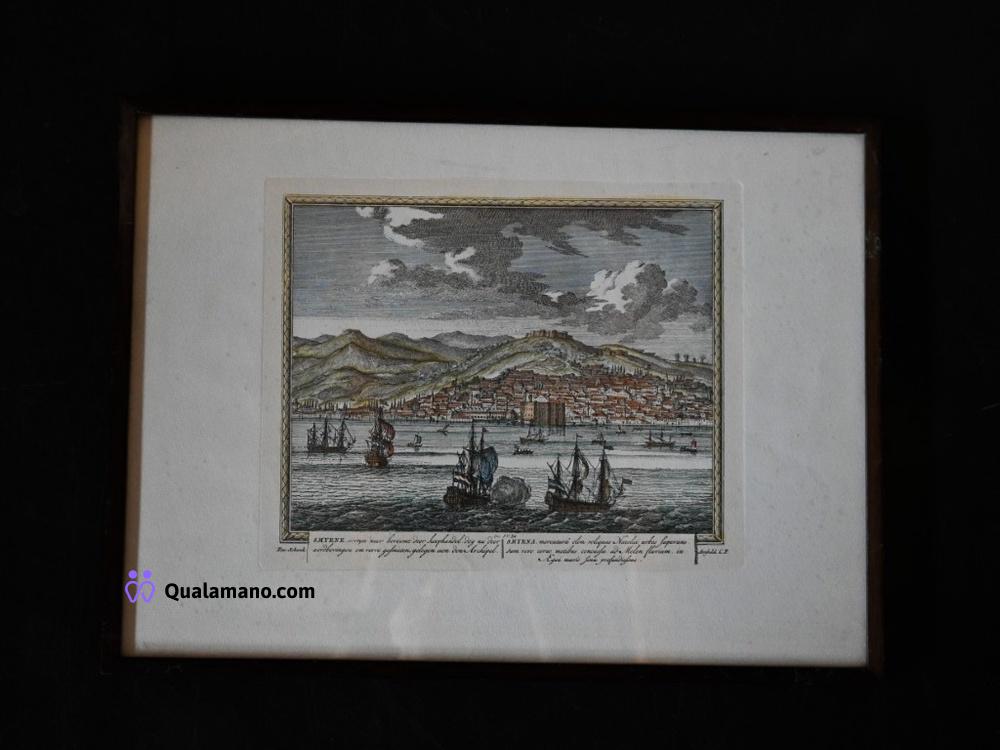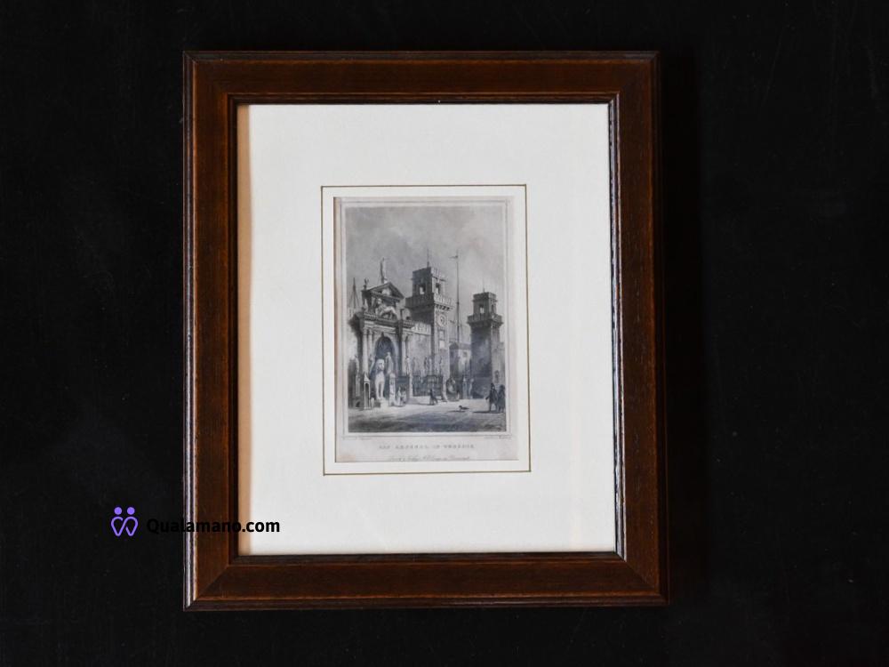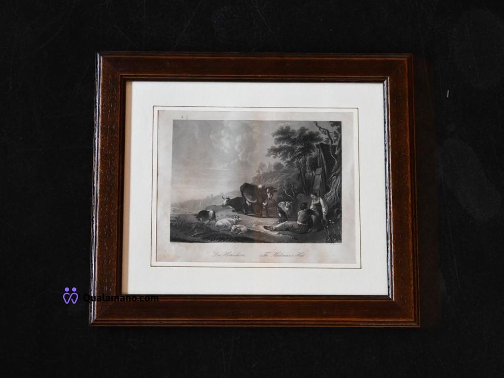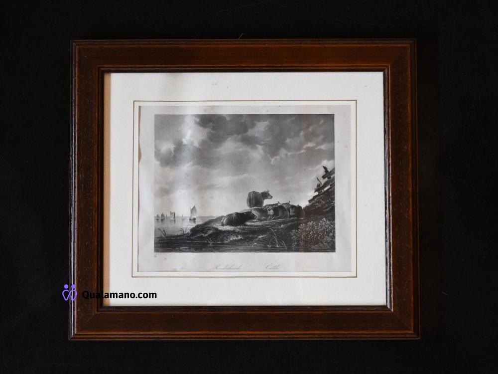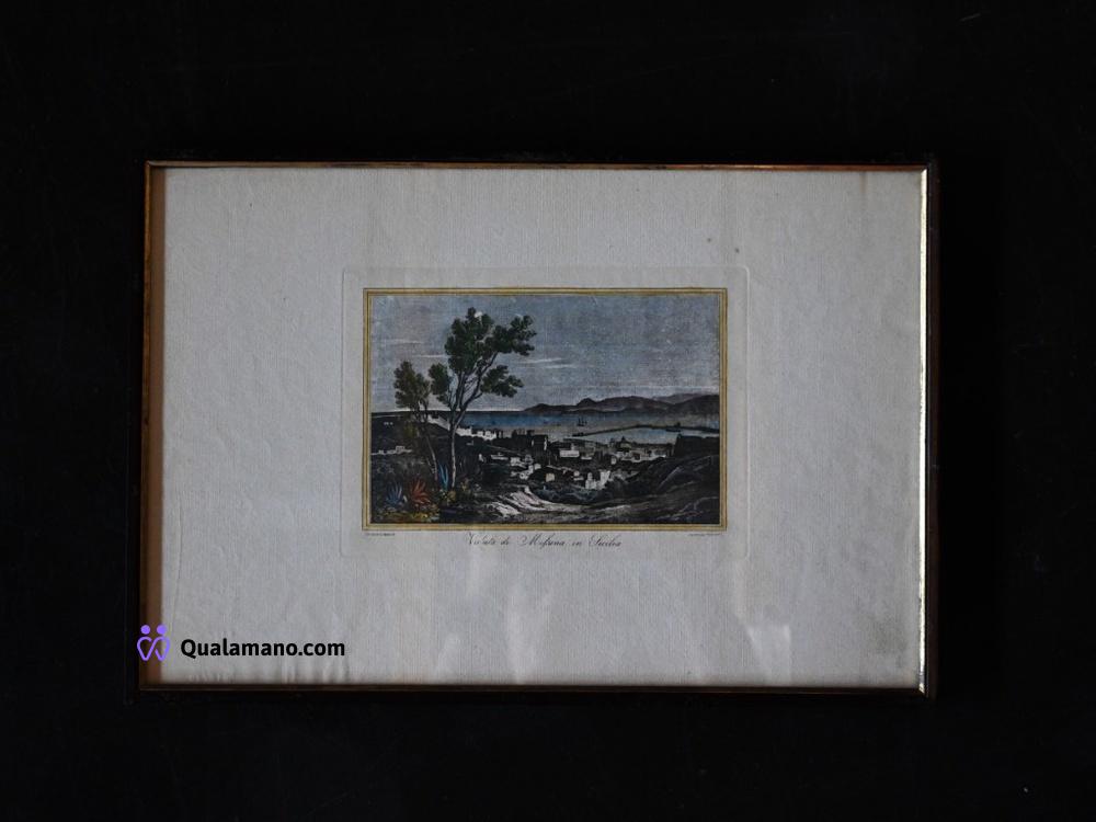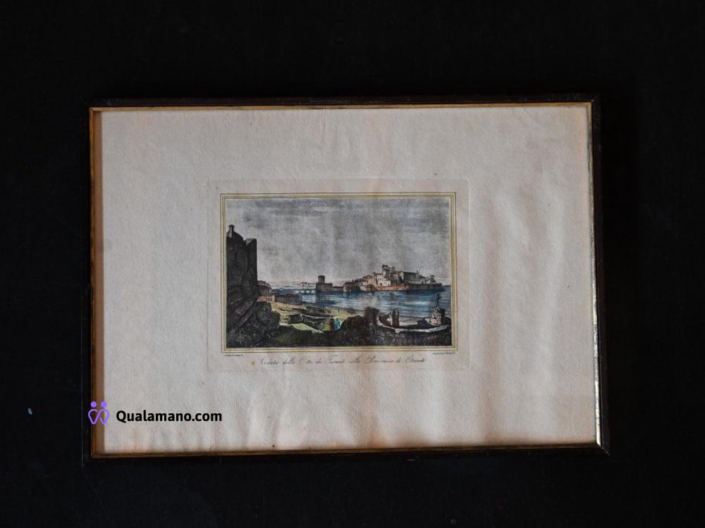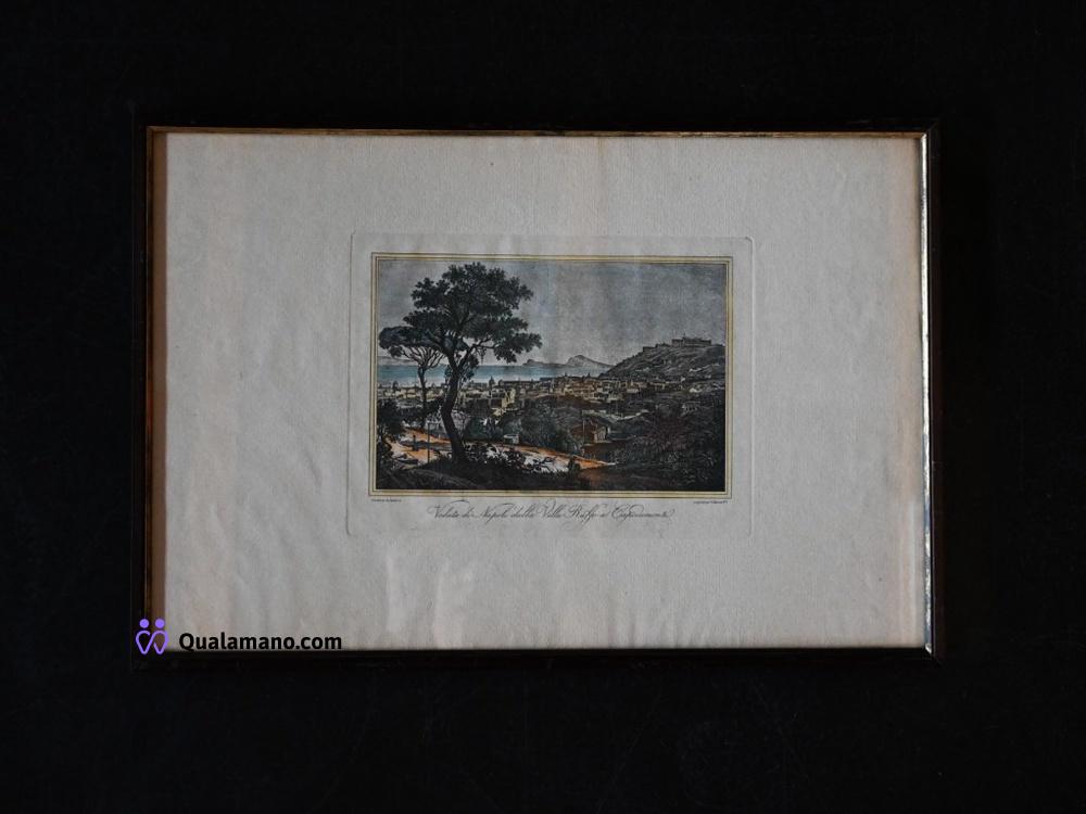 N. 4 stampe d’epoca incorniciate con vedute costiere e marine a colori. Dimensioni con cornice 45x33cmN. 3 stampe antiche acquerellate con vedute panoramiche. Dimensioni con cornice 42x29 cmN. 3 quadri con paesaggi pastorali e architetture in bianco e nero. Rivestimento posteriore decorato con cartiglio originale identificativo del laboratorio “Antichità Restauro Bertoncello”...