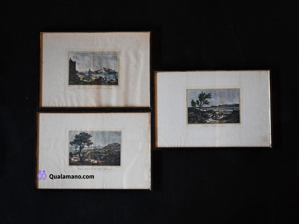 N. 3 stampe antiche acquerellate con vedute panoramiche. Dimensioni con cornice 42x29 cm