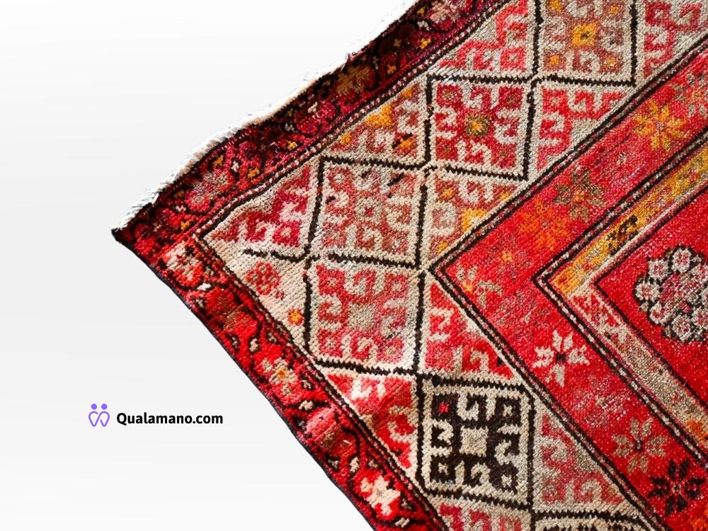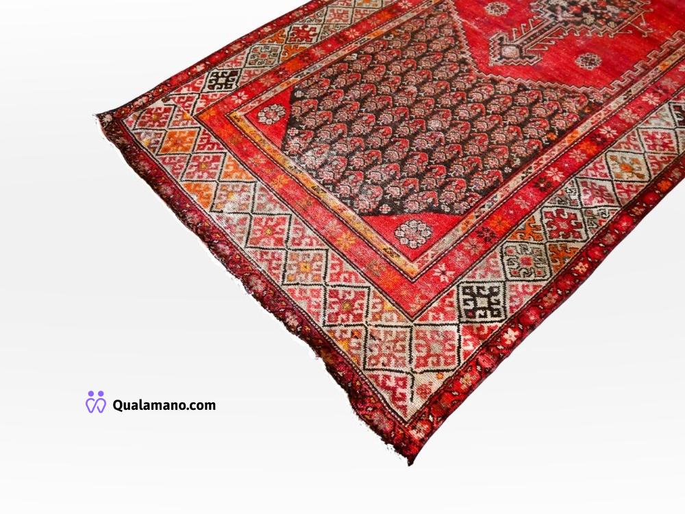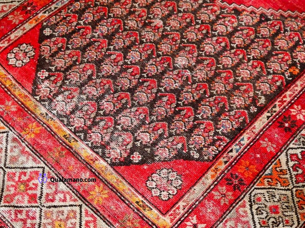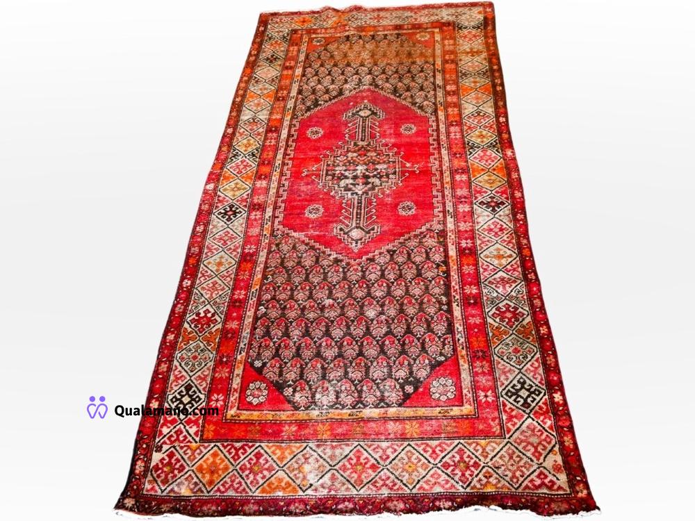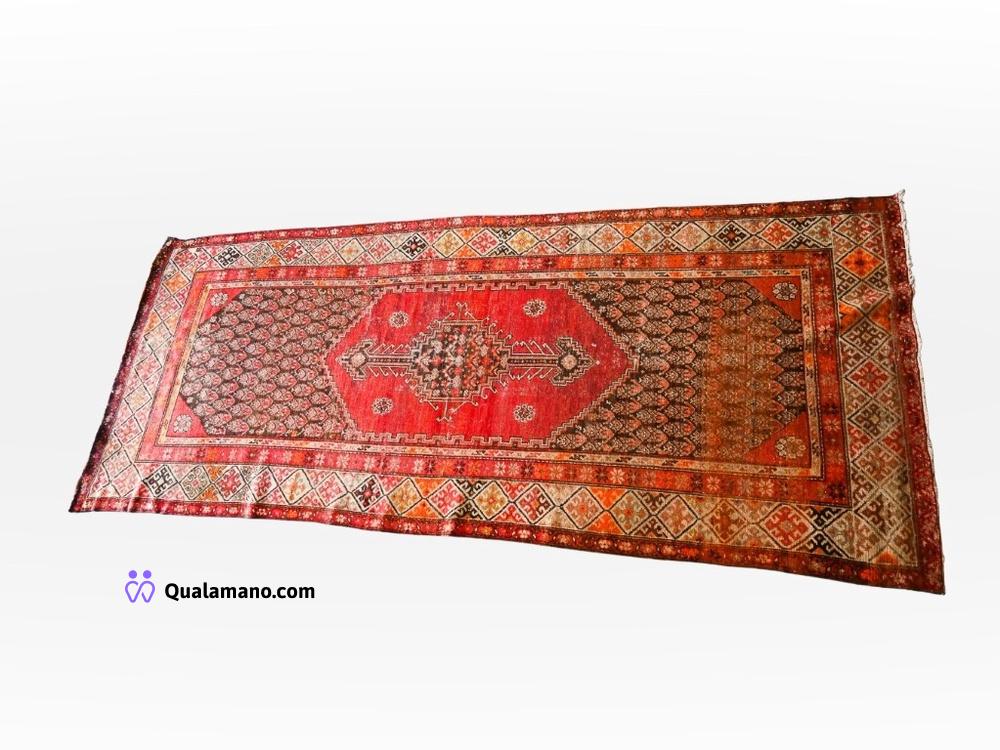 N. 1 Tappeto di tipo persiano “Malayer” anni 20, con motivo geometrico a medaglione centrale, con bordo decorato a rombi multicolore. Dimensione 329x145 cm