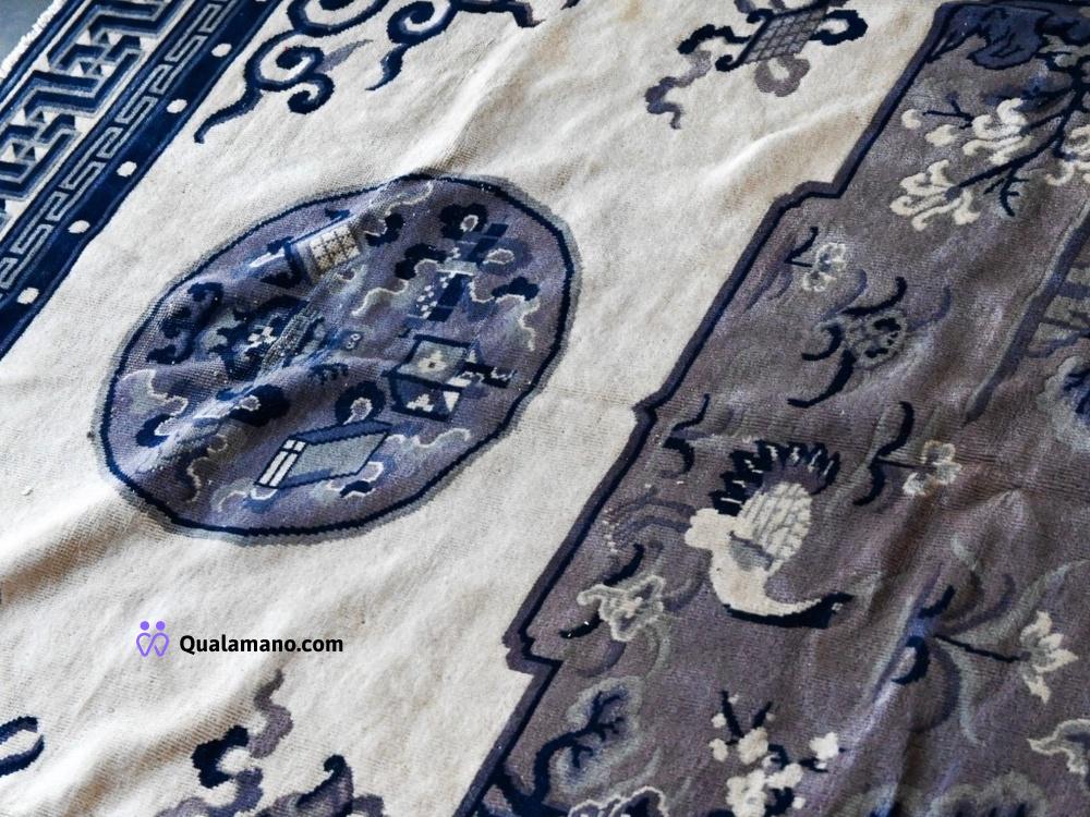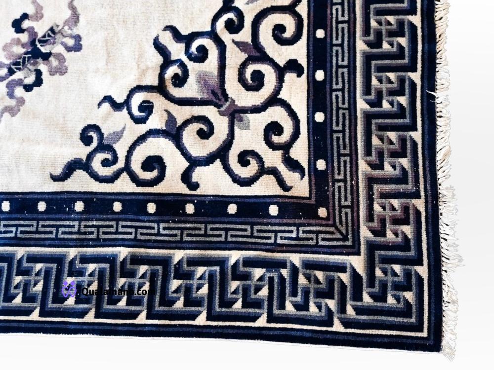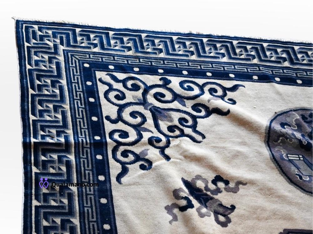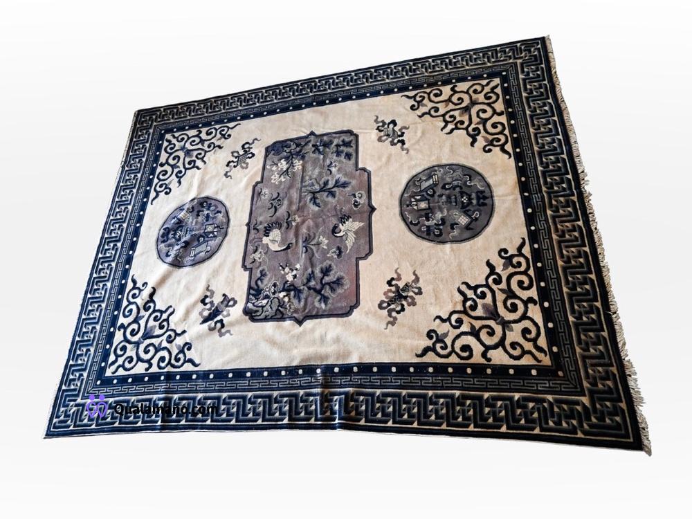 N.1 Tappeto di tipo cinese “Pechino” fine XIX secolo, con sfondo chiaro e motivi floreali blu in tre medaglioni centrali. Lavato e restaurato aprile 2025. Dimensione 287x232 cm
