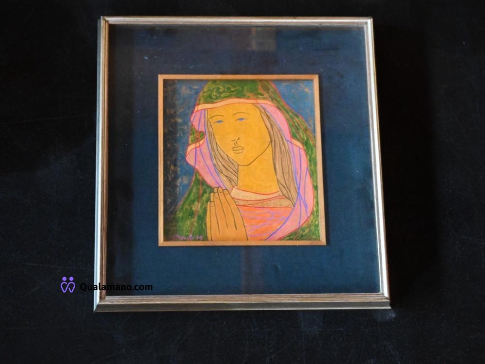 N. 1 quadro raffigurante Madonna in preghiera, tecnica mista su fondo oro con colori vivaci e tratti marcati. Riporta il timbro della ditta “Acerboni Giovanni Cornici - Quadri”. Presente anche una numerazione manoscritta in alto a sinistra: 72A454. Dimensioni con cornice 40x42 cm