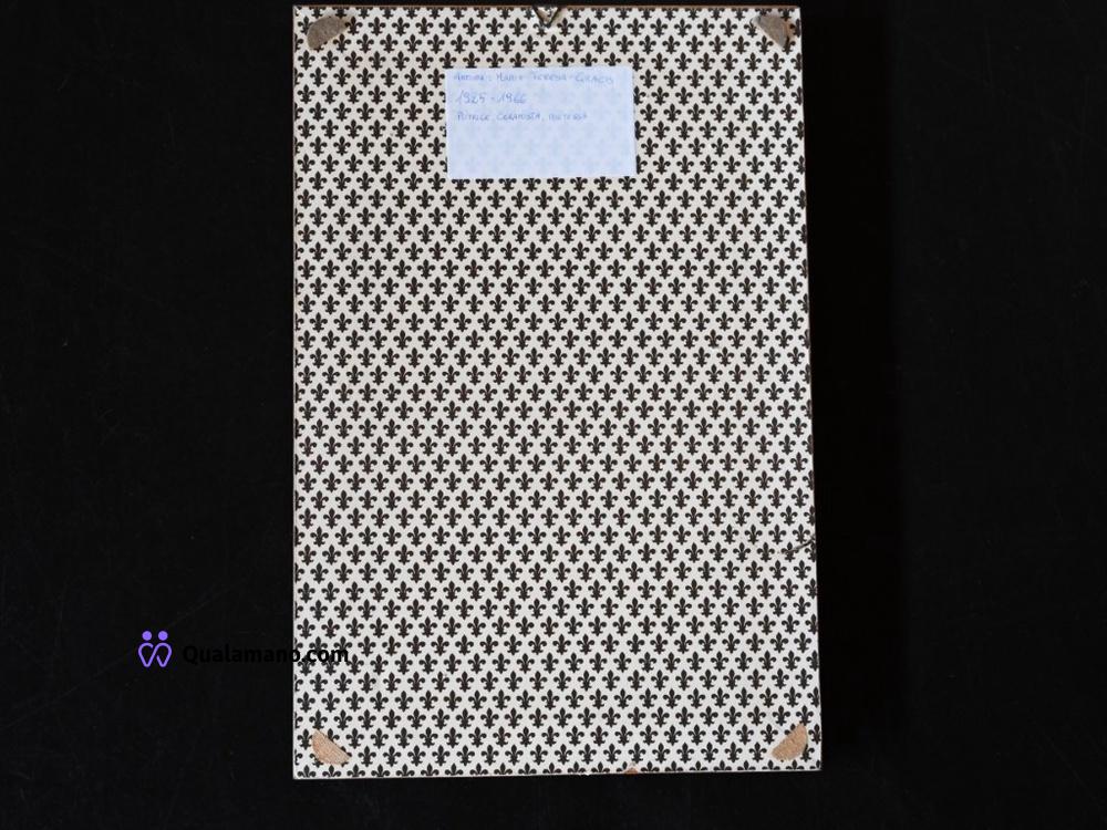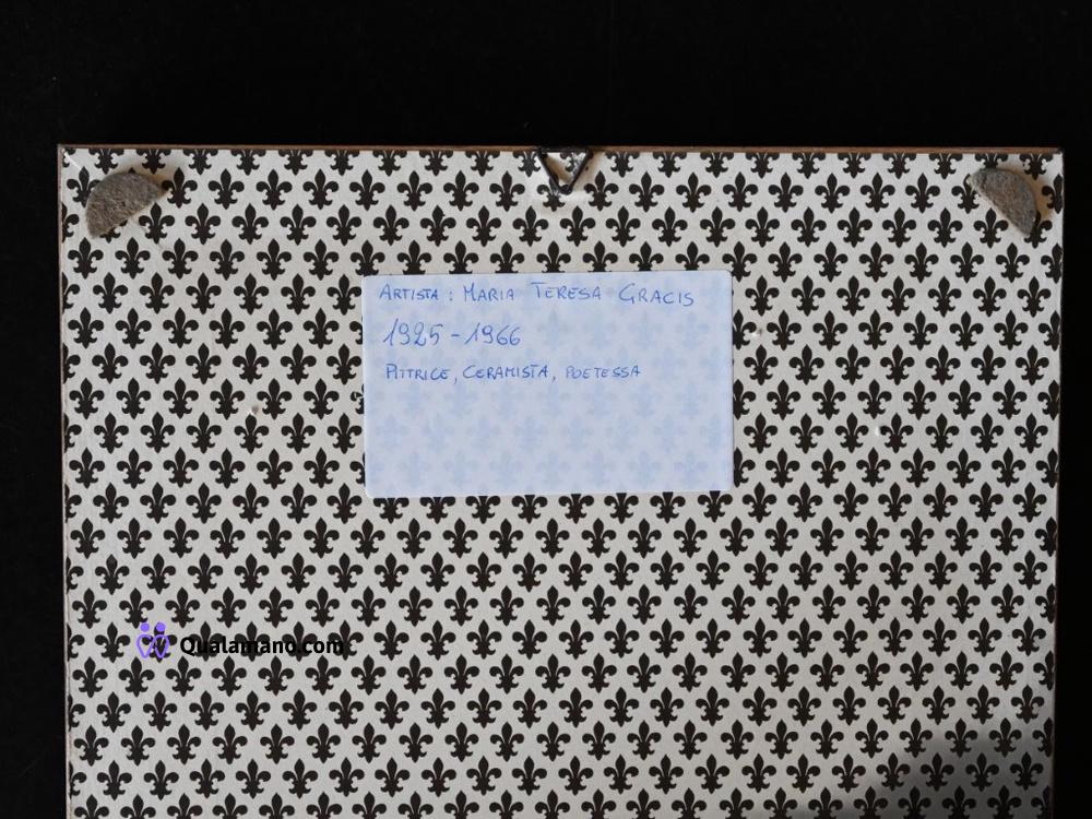 N. 1 ceramica dipinta raffigurante Madonna con Bambino, composta da piastrelle montate su supporto, in stile moderno, incorniciata in legno chiaro naturale. Etichetta manoscritta sul retro, con informazioni biografiche sull’artista Maria Teresa Gracis. Dimensioni con cornice 40x27 cm