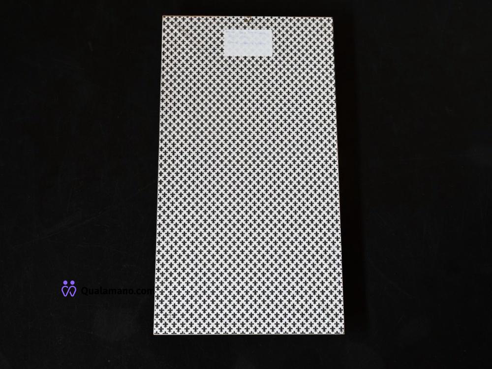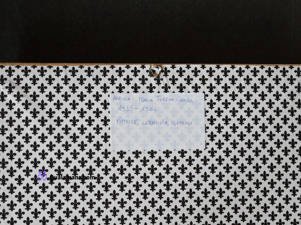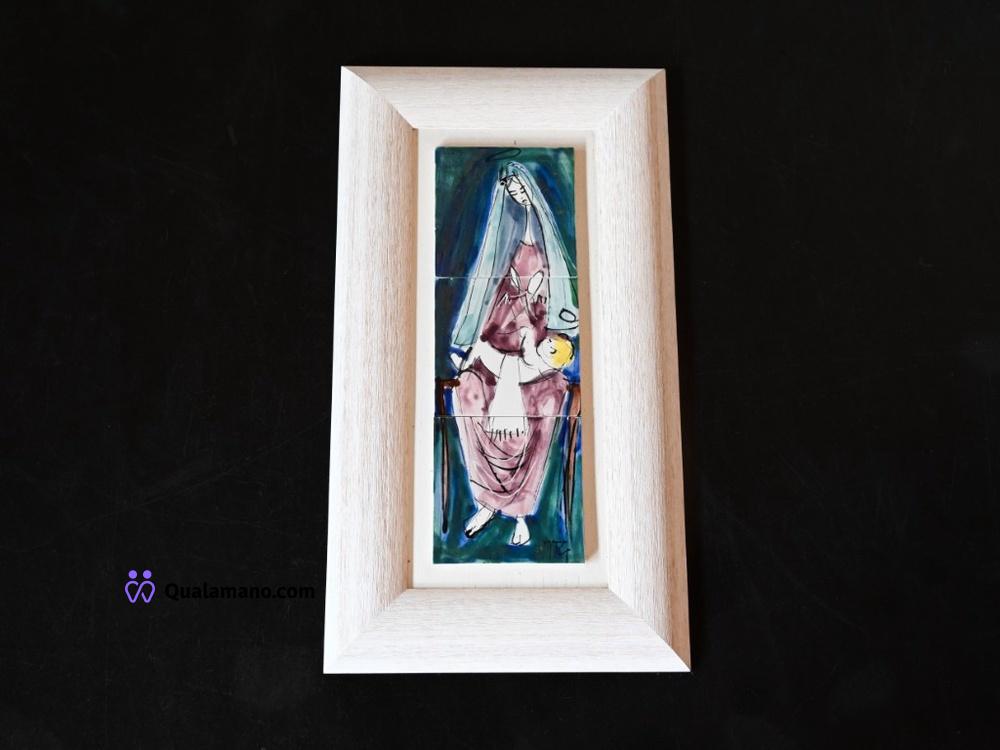 N. 1 composizione sacra su piastrelle con Madonna stilizzata che allatta il Bambino, dipinta a mano in stile moderno su ceramica smaltata, incorniciata in legno chiaro. Etichetta manoscritta sul retro, con informazioni biografiche sull’artista Maria Teresa Gracis. Dimensioni con cornice 66x36 cm
