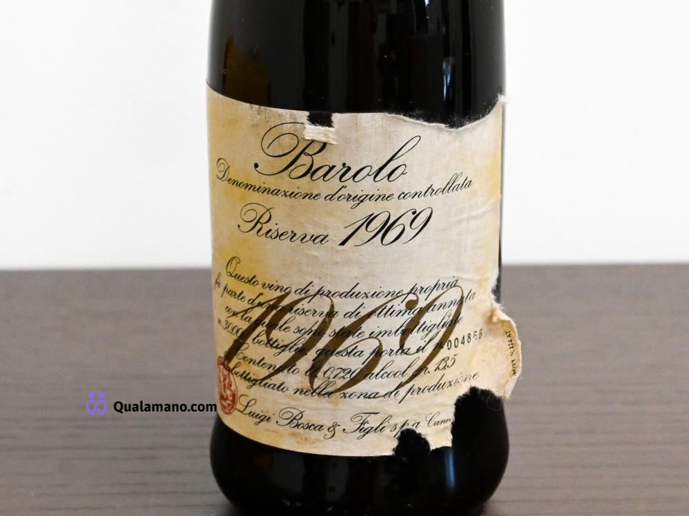 N. 1 Bottiglia storica di Barolo Riserva, vendemmia 1969, prodotta da Luigi Bosca & Figli. Vino a Denominazione di Origine Controllata, etichetta parzialmente deteriorata ma leggibile. Incisione in rilievo sulla bottiglia con stemma. 72cl, vol 13,5%