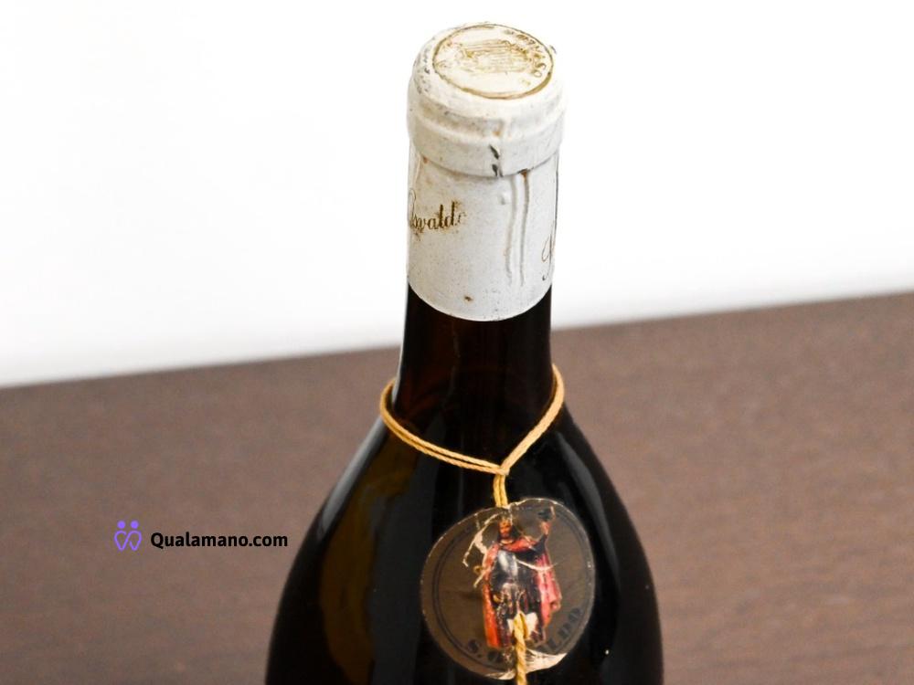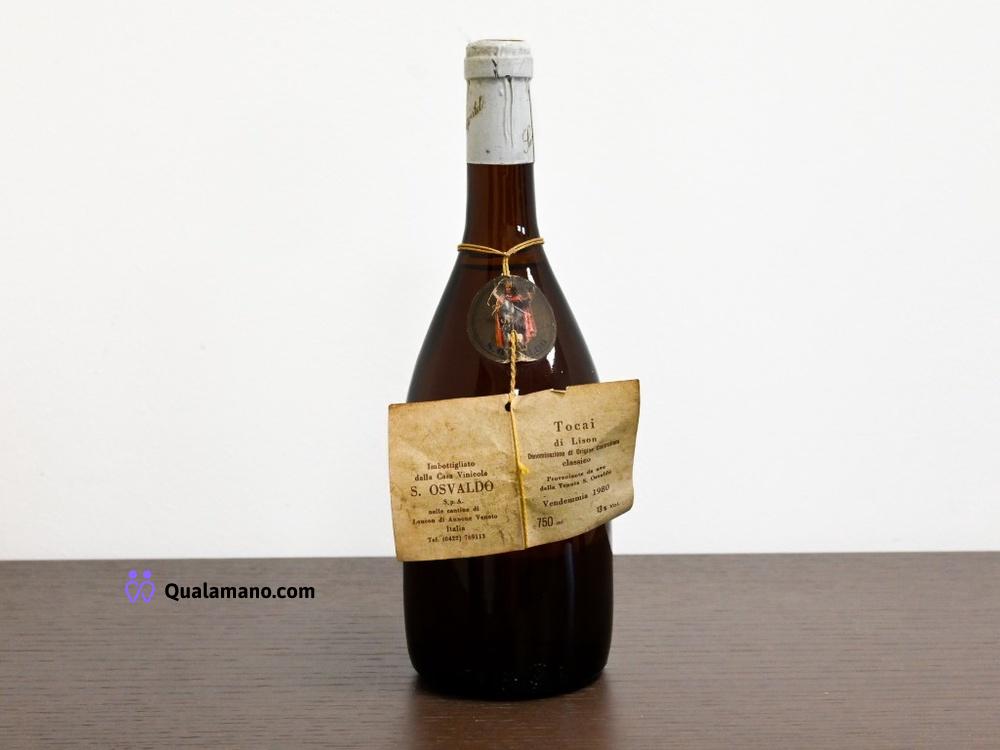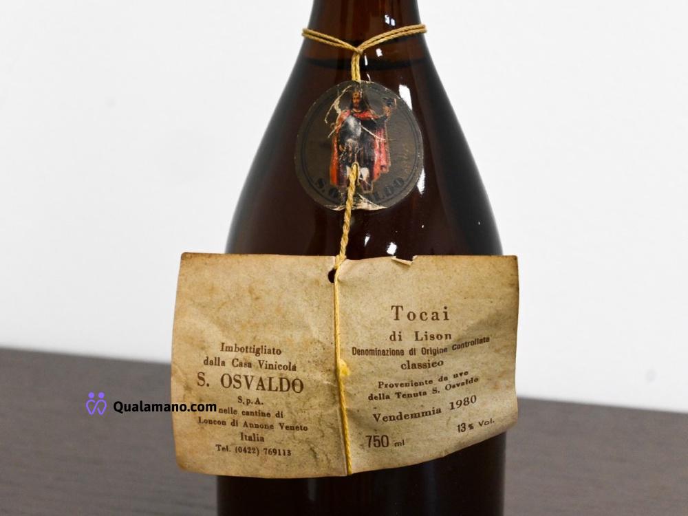 N. 1 Bottiglia di vino bianco Tocai proveniente dalla Tenuta S. Osvaldo, zona Lison-Pramaggiore, vendemmia 1980. Etichetta frontale in carta grezza legata con spago e medaglione illustrato raffigurante San Osvaldo. 750 ml, vol. 13%.